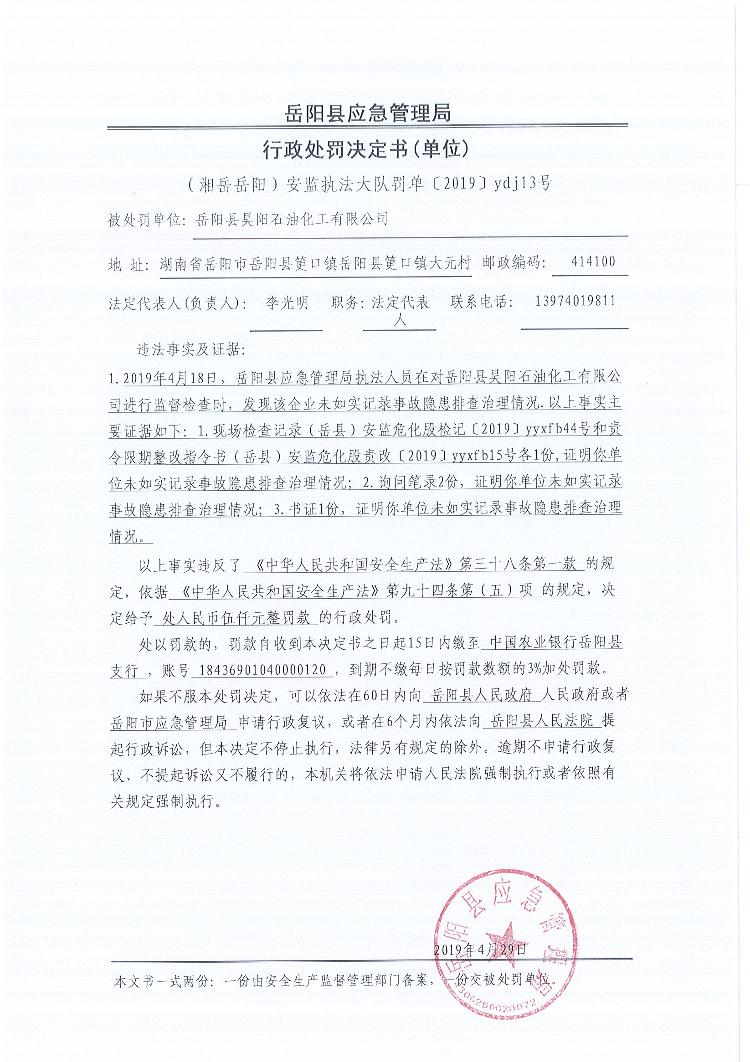 行政处罚决定书(湘岳岳阳安监执法大队罚单〔2019 〕ydj13号)