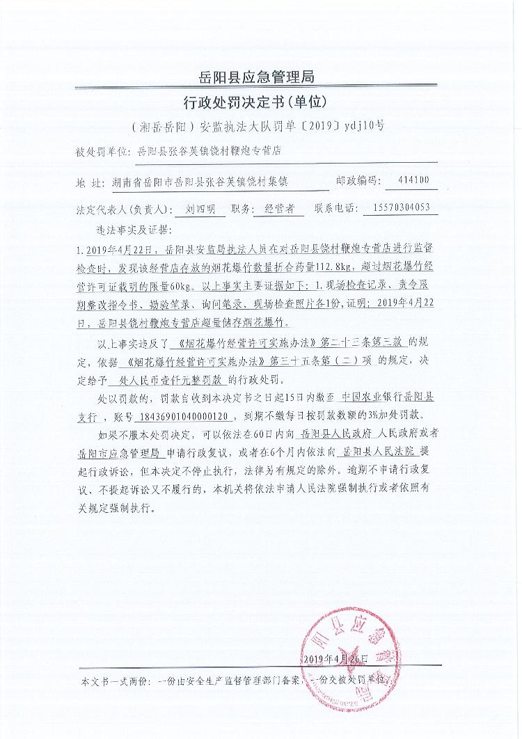 行政处罚决定书(湘岳岳阳安监执法大队罚单〔2019 〕ydj10号)
