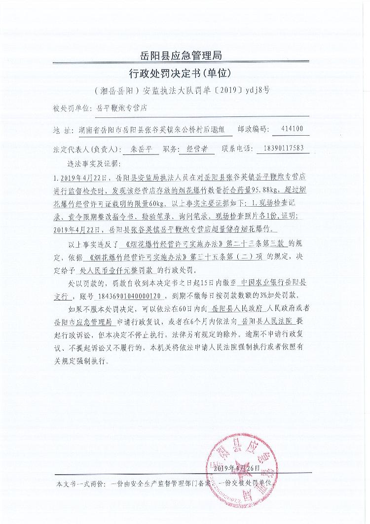 行政处罚决定书(湘岳岳阳安监执法大队罚单〔2019 〕ydj8号)
