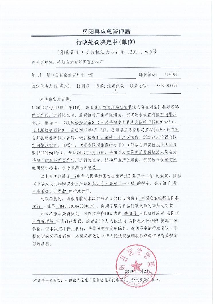 行政处罚决定书(湘岳岳阳安监执法大队罚单〔2019 〕yq5号)