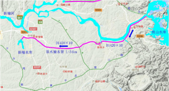 (4)管线布置。本次铁山水库至新墙水库原水输水管从铁山水库大坝沿现状道路 S201 接入新墙水库。