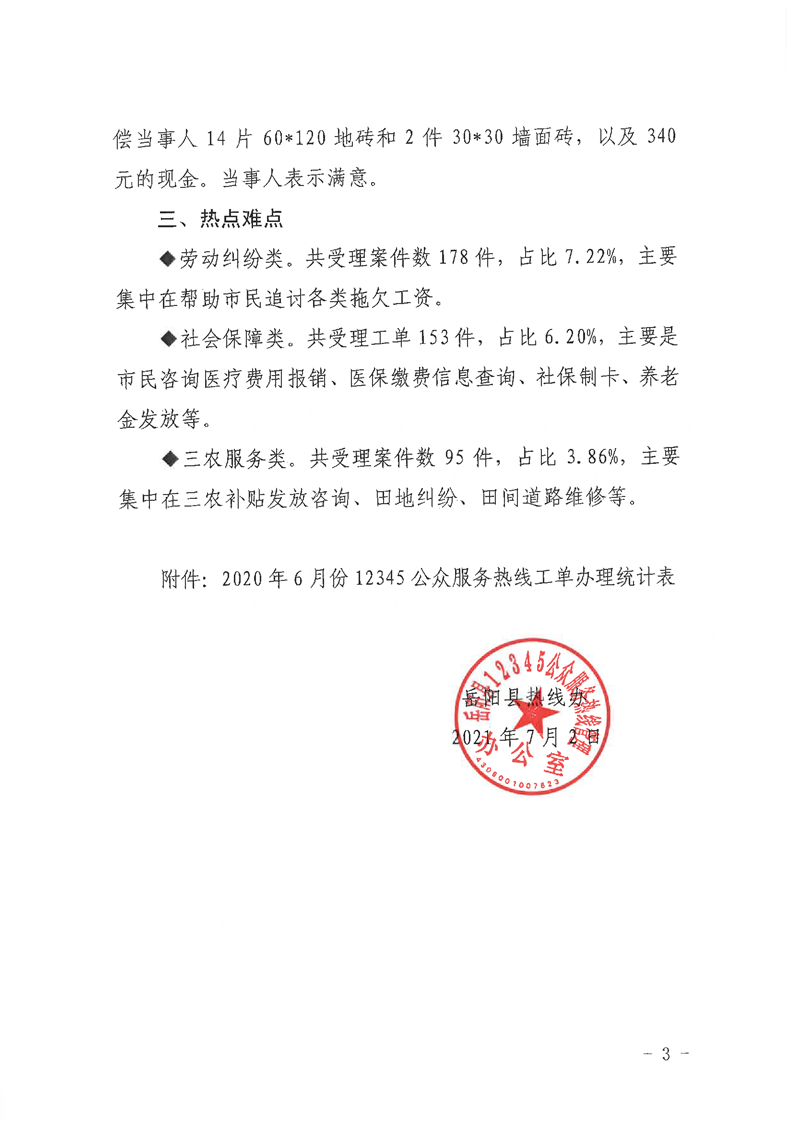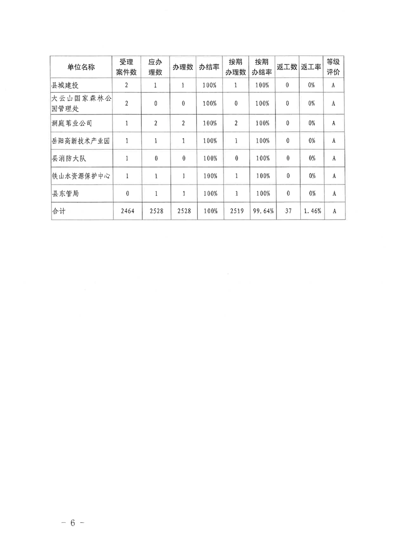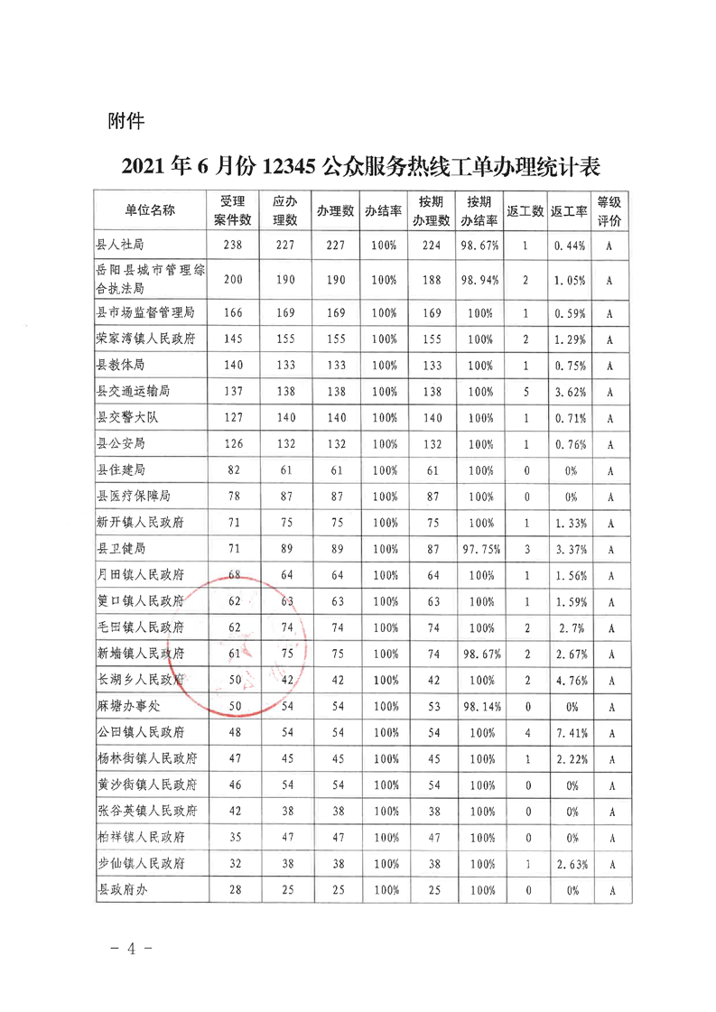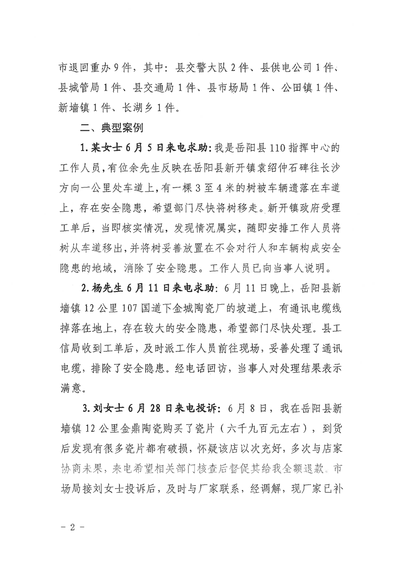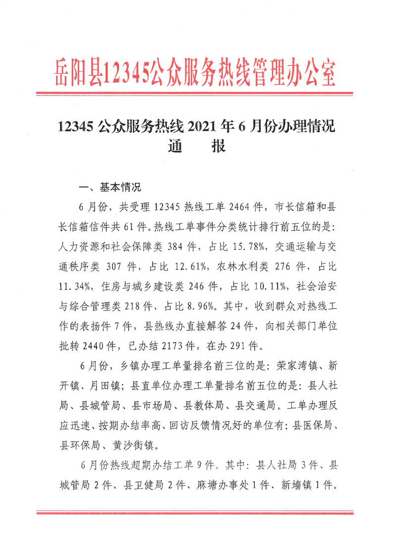 岳阳县12345公众服务热线2021年6月办理情况通报