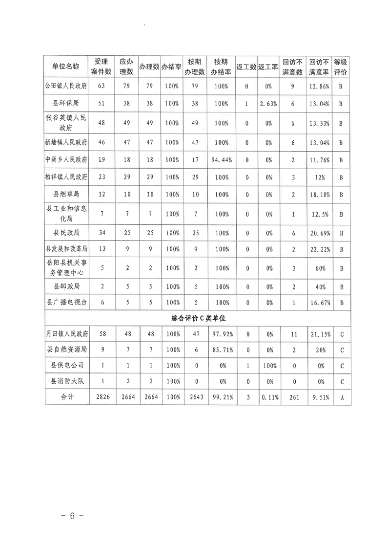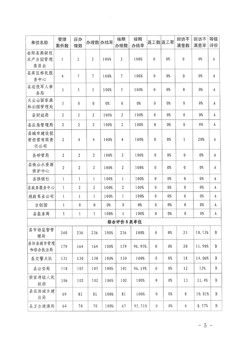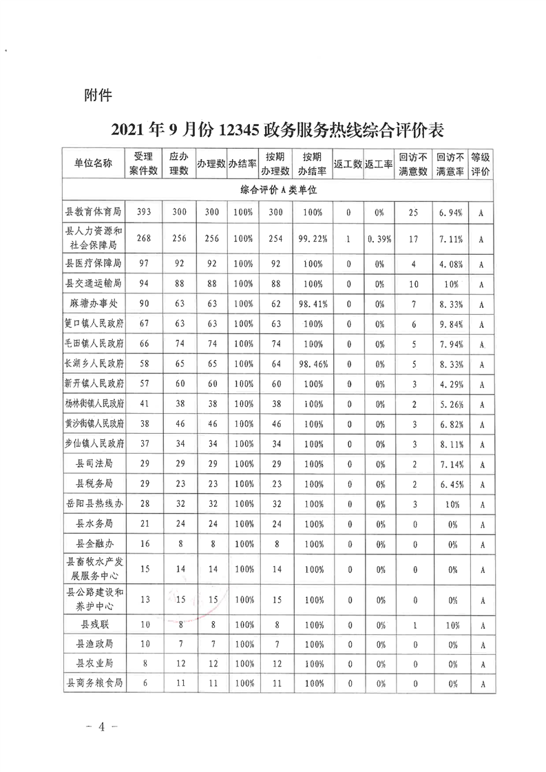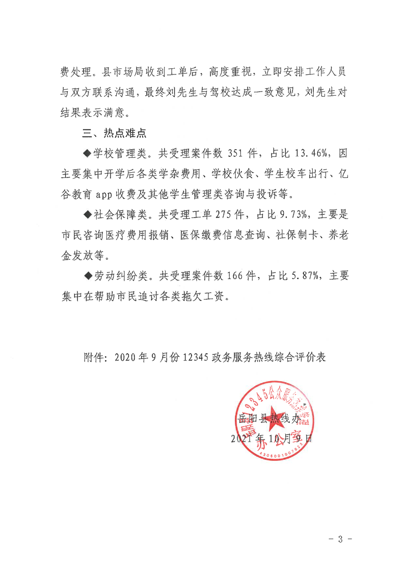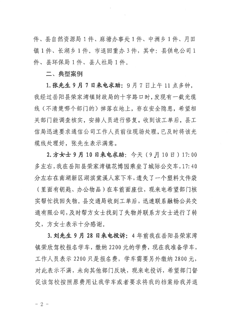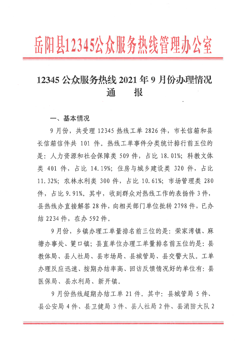 岳阳县12345公众服务热线2021年9月办理情况通报