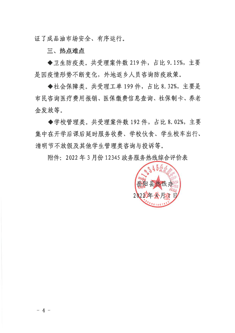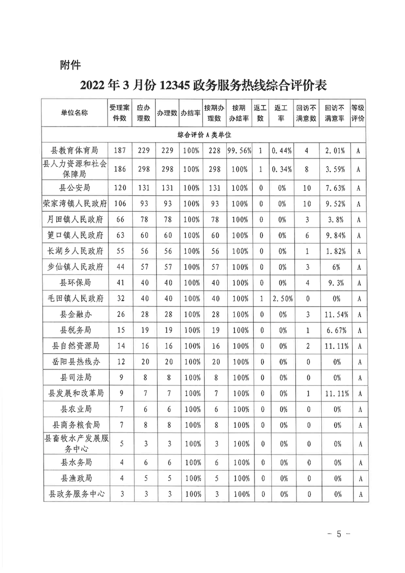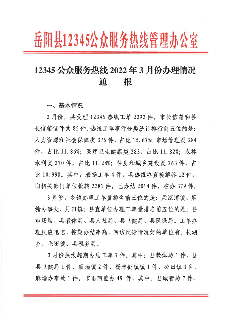 岳阳县12345公众服务热线2022年3月办理情况通报