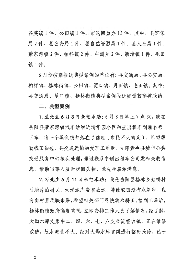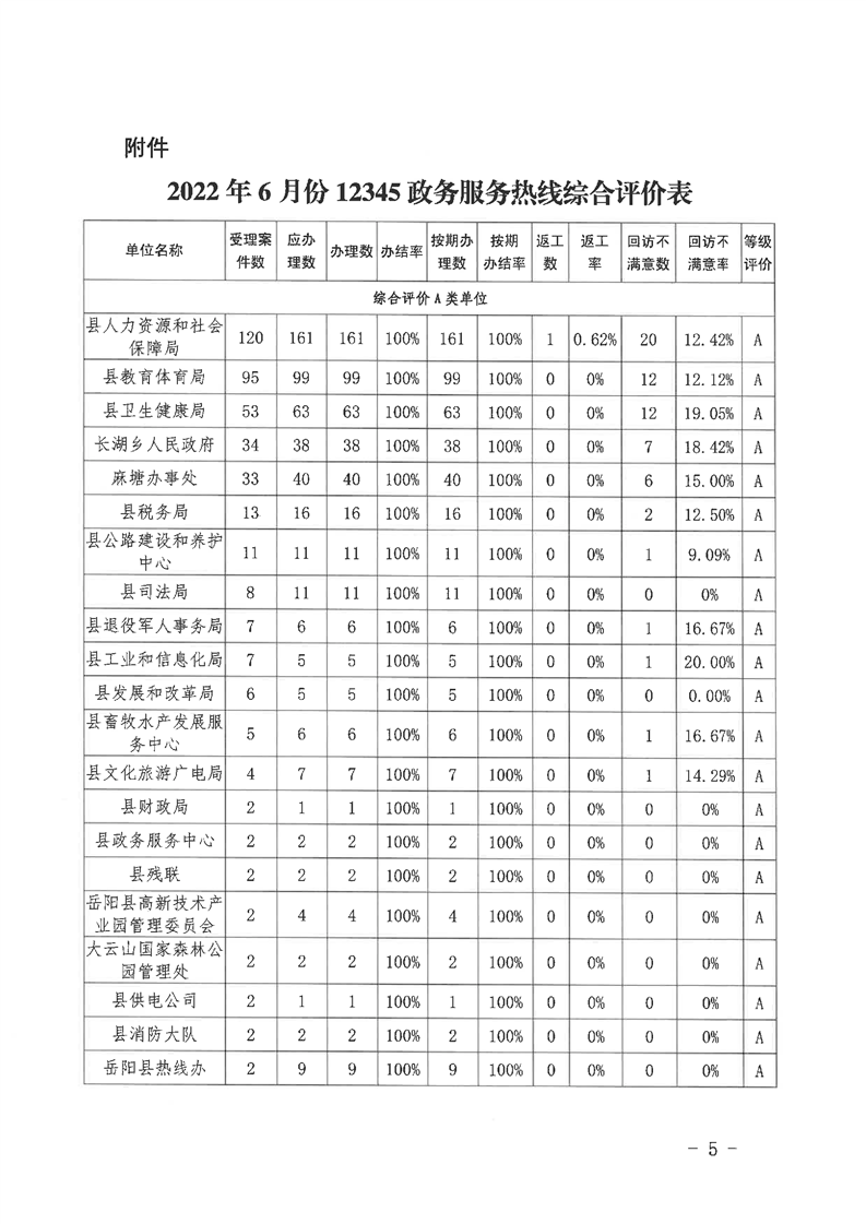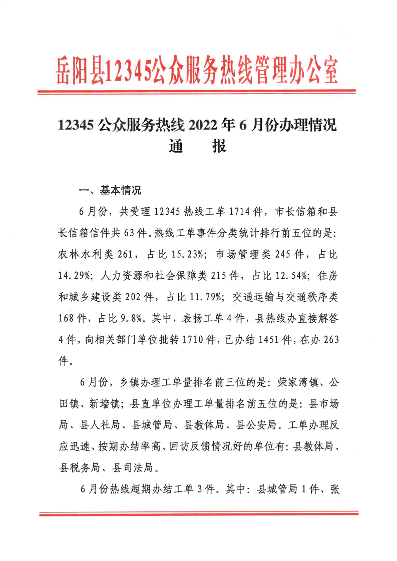 岳阳县12345公众服务热线2022年6月办理情况通报