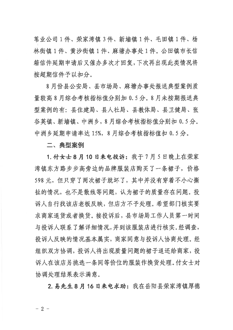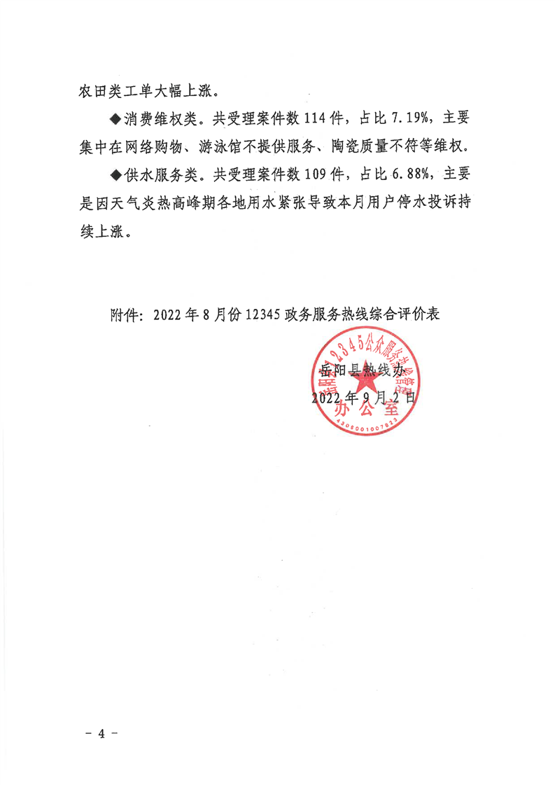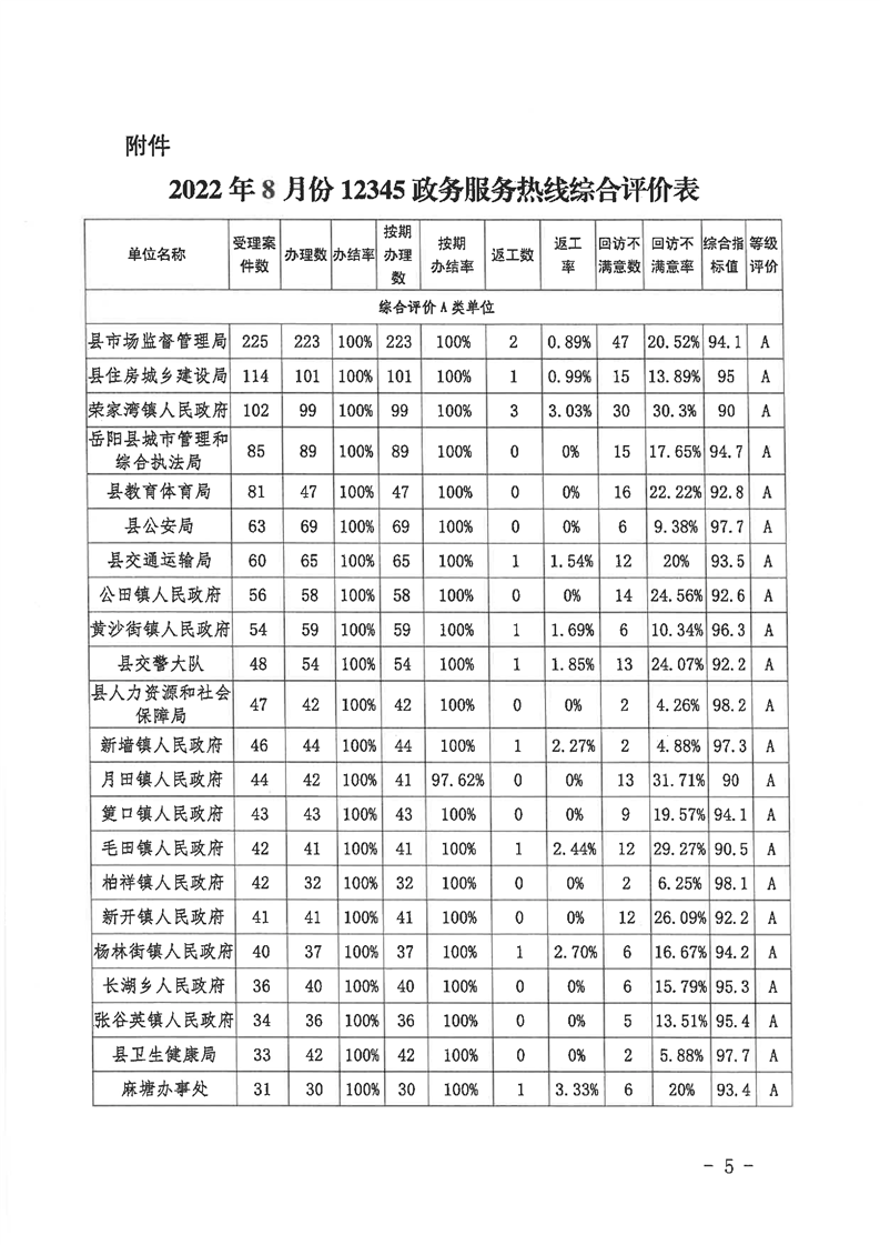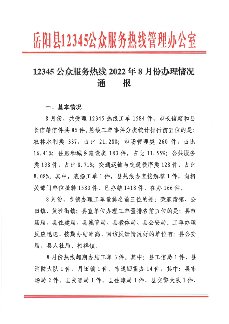 岳阳县12345公众服务热线2022年8月办理情况通报