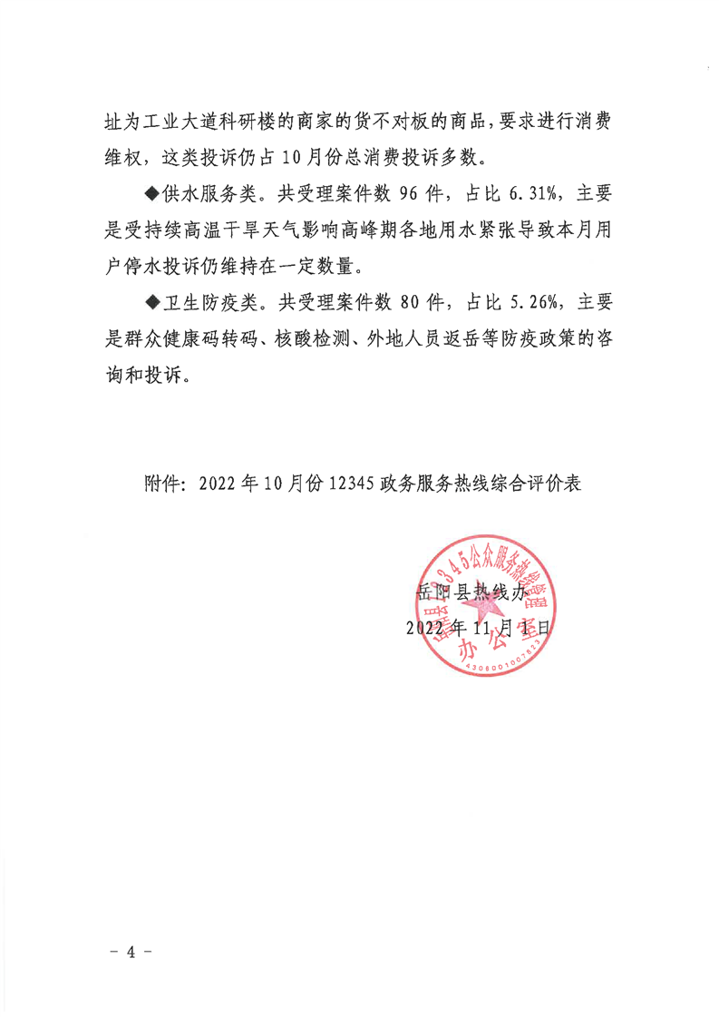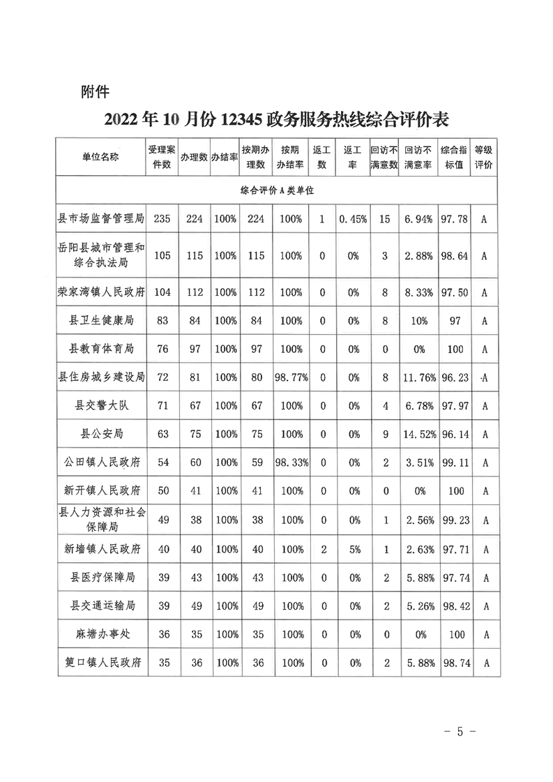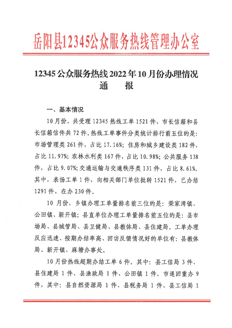 岳阳县12345公众服务热线2022年10月办理情况通报