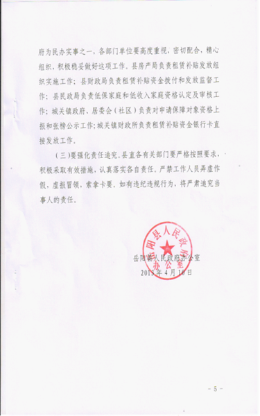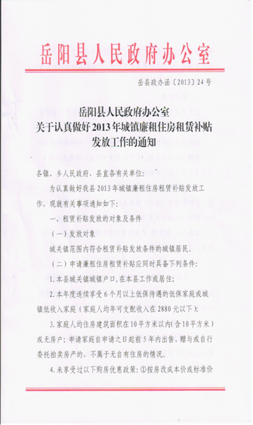 (五)发放。廉租住房租赁补贴对象名单确定后,县住房保障办汇总填写《岳阳县2013-廉租住房租赁补贴保障花名册》。