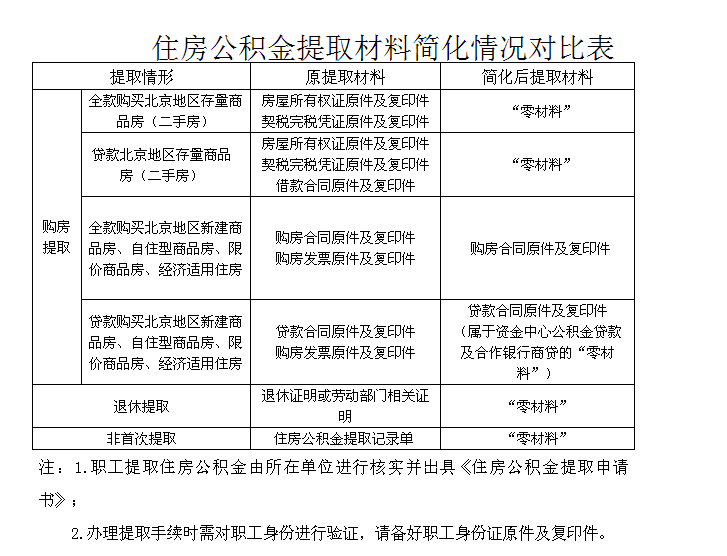 以承诺制为基础,根据信息共享程度,分类实现提取证明材料“大瘦身”。“瘦身”后,符合条件的职工购买北京地区存量商品房(二手房)提取、退休提取、非首次提取、资金中心住房公积金贷款及合作银行商业贷款购房提取,通过身份验证后,均实现“零材料”办理。