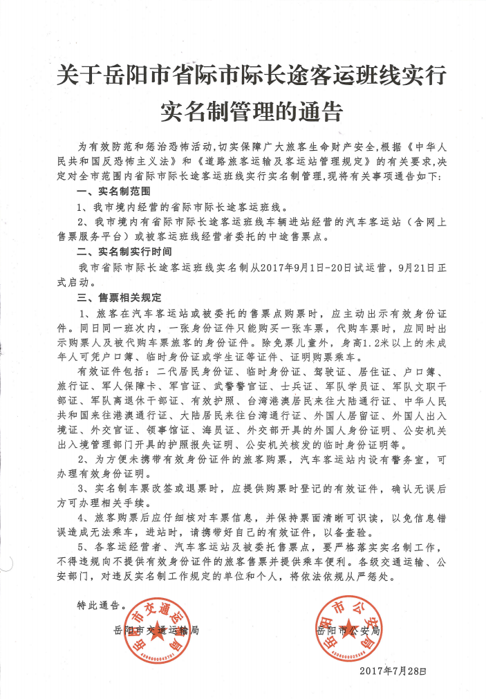 关于岳阳市省际市际长途客运班线实行实名制管理的通告
