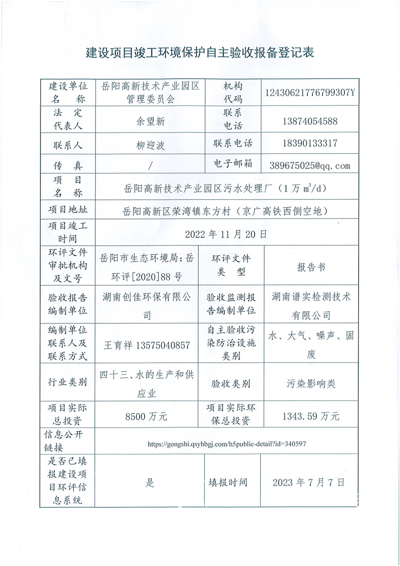 岳阳高新技术产业园区污水处理厂项目竣工环境保护自主验收报备登记表