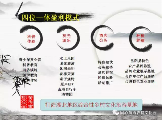 目前公司正申报湖南省五星级乡村旅游区(点),具体实施方案也正在紧锣密鼓地开展中。同时公司还就建设岳阳市青少-国防教育基地项目进行了申报,预计在未来1-3-时间里,公司将打造出一个文化旅游与国防教育相结合的示范性基地。从而有力地推进农村经济和社会各项事业的快速发展。未来文化园将发展成为对外开放的重要窗口和岳阳县农业发展的产业联合发展基地,将通过市场运作,使之成为岳阳县的靓丽名片。