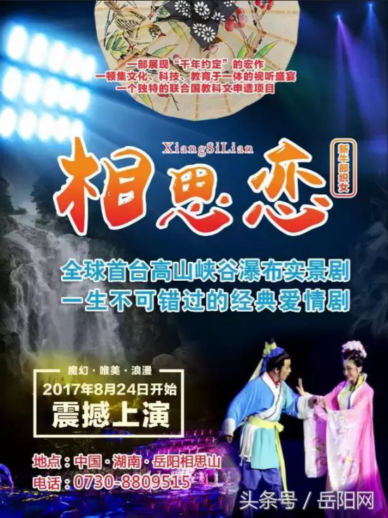 全球首台高山峡谷瀑布实景音乐剧《相思恋》将于8-24晚8点亮相岳阳相思山。