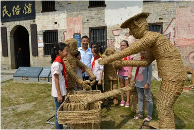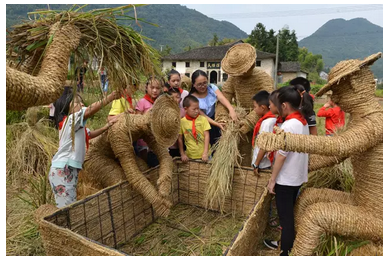 9-18,张谷英景区很有创意地把一根根不起眼的稻草,做成数十组造型迥异、惟妙惟肖、憨态可掬的创意稻草作品,摆放在景区,让游客更真实地去体验农耕文化。