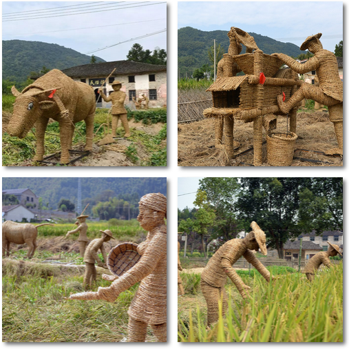 出而作,落而息,凿井而饮,耕田而食。在民俗文化馆前的田垄里,犁地、播种、插秧、收割及牧童放牛等几组由稻草制作的艺术作品错落有致地摆放在稻田中,将一些早期农村生产生活的场景活灵活现展现出来了。