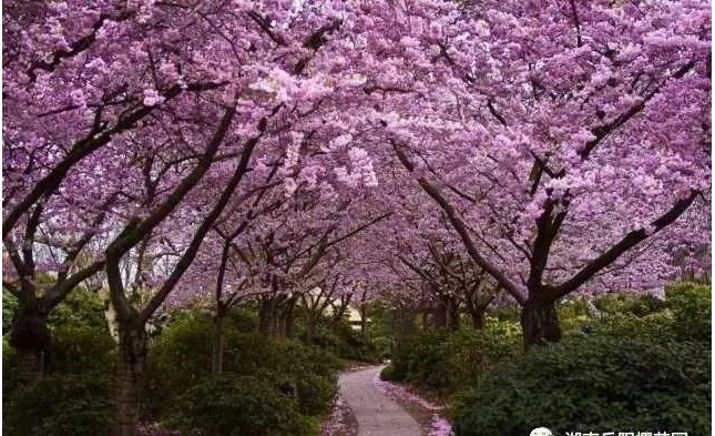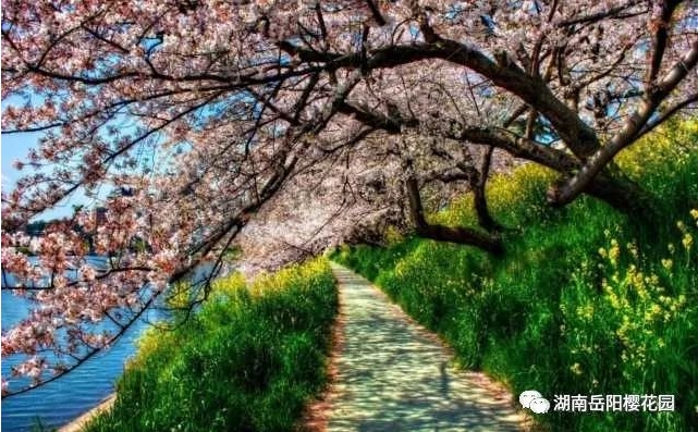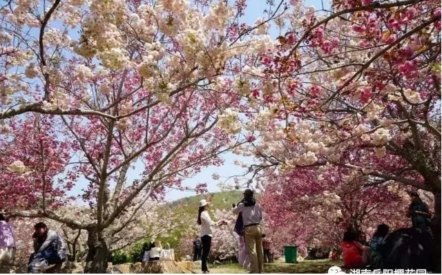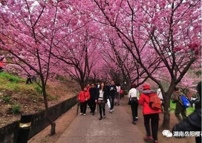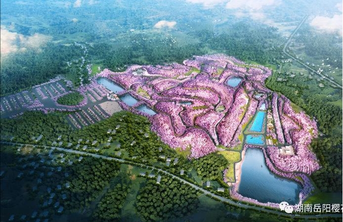 岳阳樱花园,占地1063亩,2000年建园,园区先后从全国各地引进大规格樱花数十品种,10万多株,十年以上树龄2万多株,是全国最大专业樱花园。三层三千亩樱海。充分利用樱花落叶透视性強的特点,在樱花树下择时种植花期相同的二月兰,油菜花等千亩草花,杂植落叶紫红玉兰,每年3、4月开花时间,上面千亩樱花盛开,下面千亩草花竞放,中间亿万落樱飞舞,构成花团锦簇的壮丽景观。