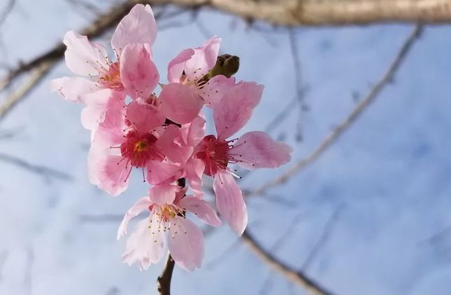 花期3月中旬,单瓣花,淡粉红色,4~5朵花形成总状花序,萼片及花梗上有毛。树形高大,可达10~15米。小花柄、萼筒、萼片上有很多细毛,萼筒上部比较细,花蕾是粉红色,在叶子长出前就盛开略带淡红色的白花,给人十分华丽的印象
