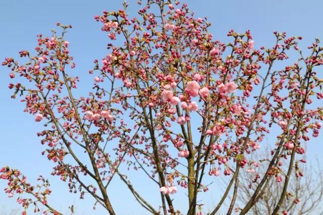 一大片的樱花树,盛开时一团团一簇簇,