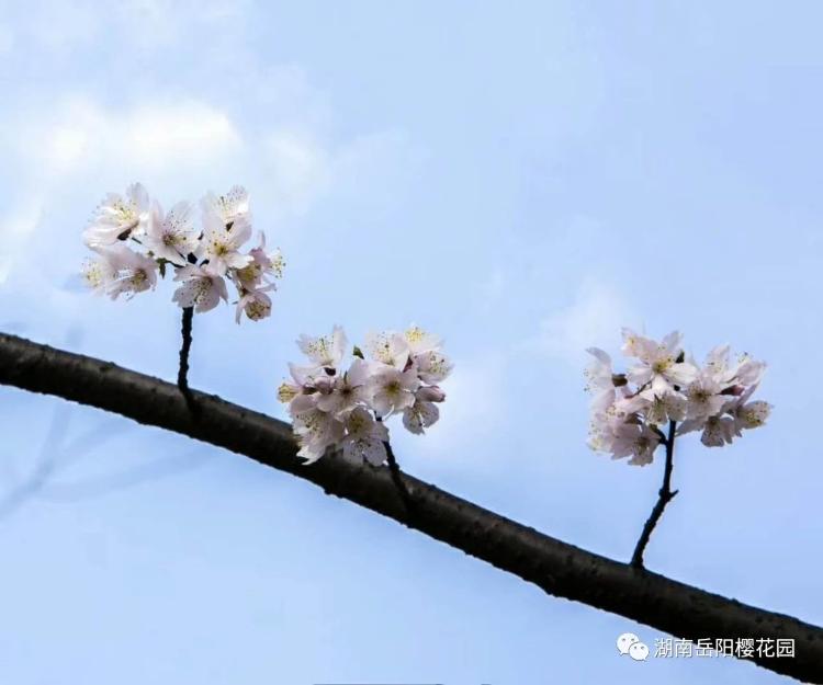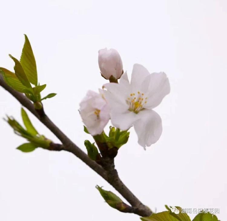 还记得,隆冬时节,岳阳下了一场大雪,所有的樱花树都落尽了叶子。3月初,在樱花开放的时候,叶子也开始萌动生长。长形的细叶一片片地从在花团的侧旁和花间长出,翠绿娇嫩,雀雀跃跃的样子,把一个个花枝装点成一个熙熙攘攘热热闹闹的生命世界。