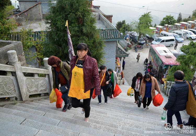 4月17日下午,上山的路上人流众多、摩肩接踵,一拨又一拨的车辆沿山路缓慢行驶。人流中,有前来踏青游玩的青年男女,还有服饰标识统一的虔诚香客,他们手捧醮布,一路上山一路朝拜。
