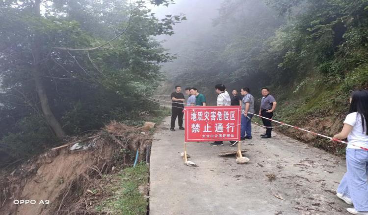 喻树长一行一到大云山便不顾山路难行,马不停蹄深入景区仔细查看了解观音殿、真君殿、祖师殿、等景点及游步道受灾情况,慰问看望在景区一线抢修的干部职工,指导大云山景区灾后重建工作。
