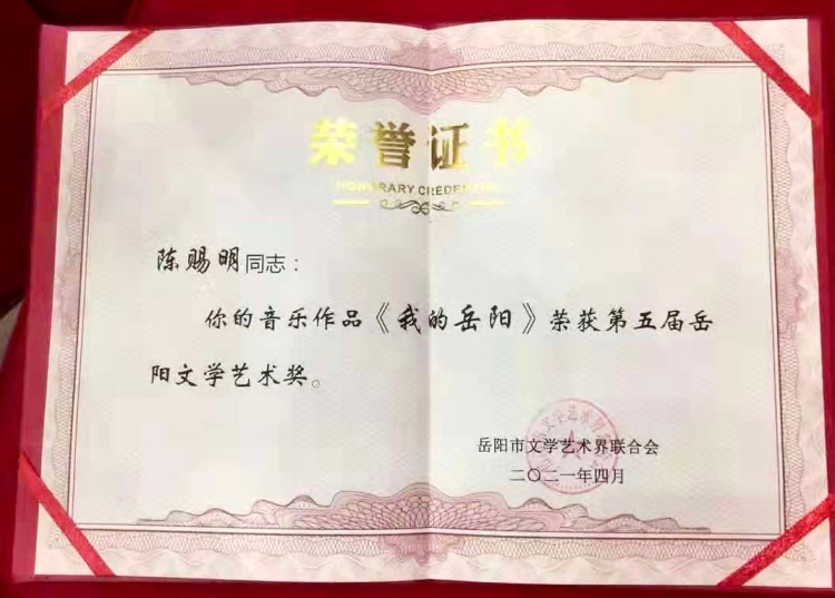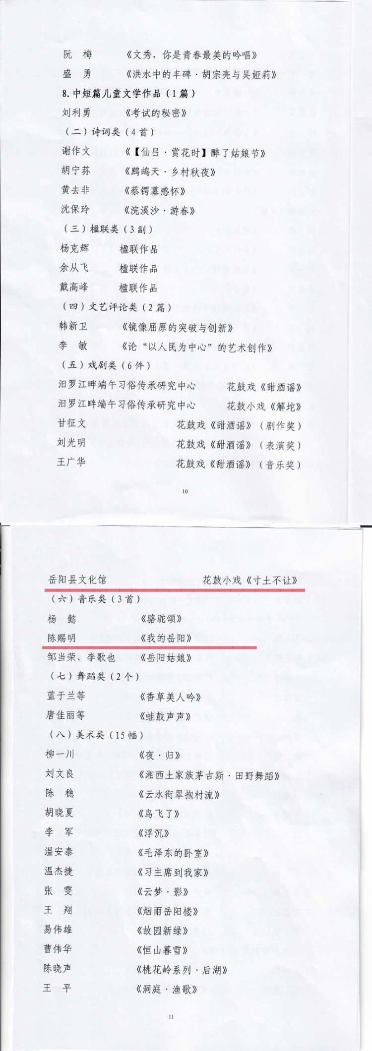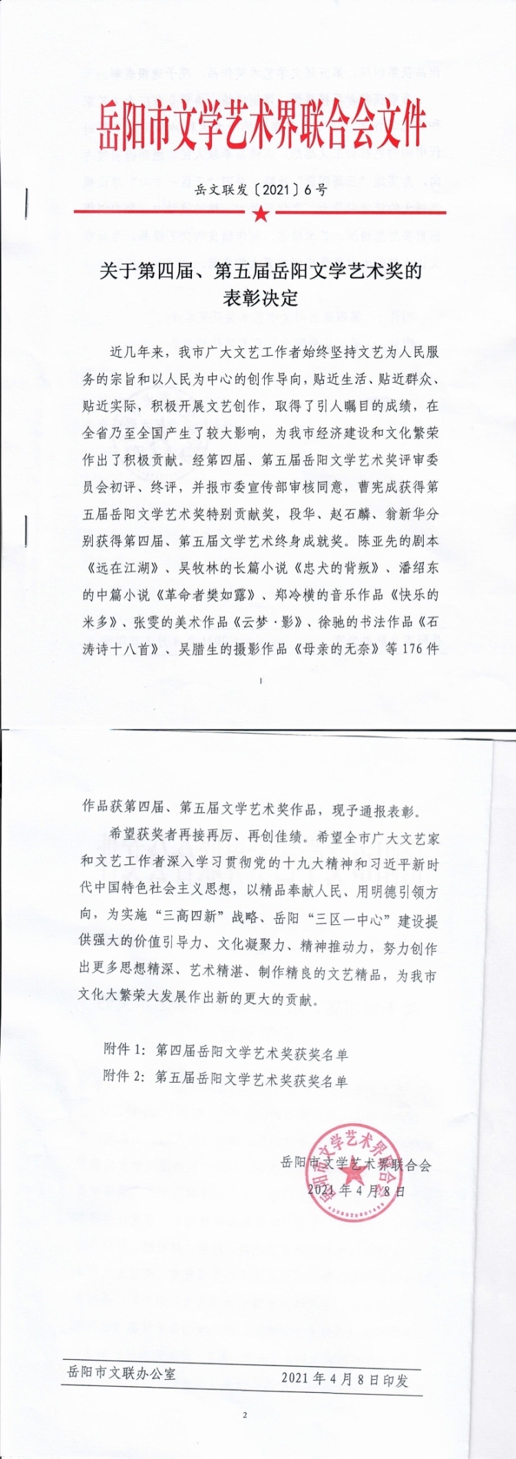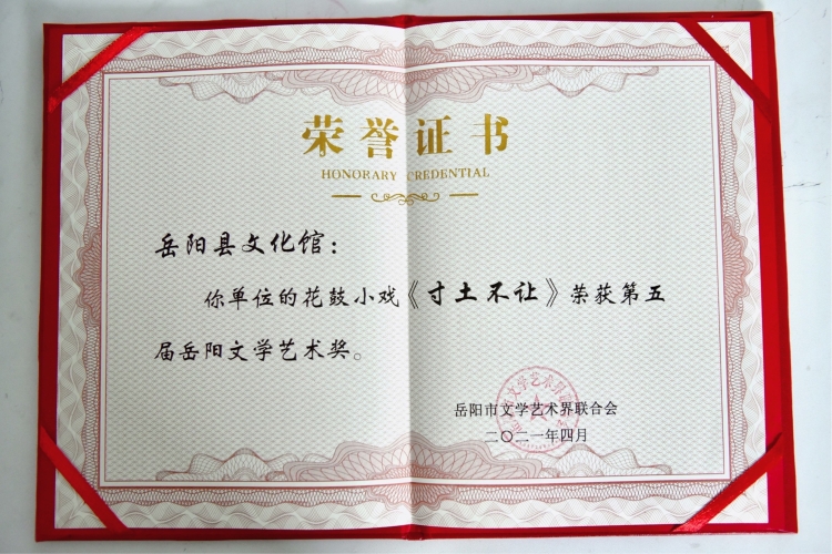 2021年4月9日上午,第四届、第五届岳阳文学艺术奖颁奖大会在岳阳文化艺术会展中心举行,表彰优秀文艺作品和文艺工作者。第四届、第五届文学艺术奖共评出特别贡献奖1人,终身成就奖2人,文学艺术奖作品176件。岳阳县文化馆原创歌曲《我的岳阳》、原创花鼓小戏《寸土不让》荣获第四届、第五届岳阳文学艺术奖。