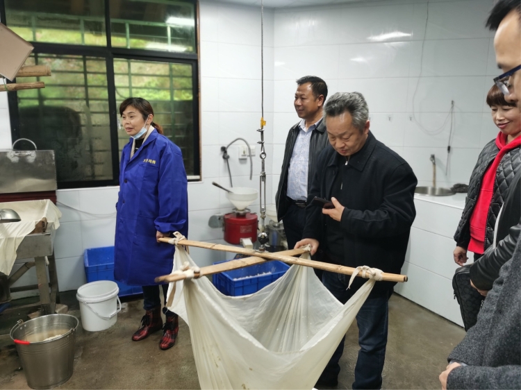 何局长等调研组一行即刻赶往张谷英参观张谷英油豆腐制作技艺作坊,张谷英油豆腐作坊老板张海龙为大家讲解市级非遗项目《张谷英油豆腐制作技艺》的制作工序。通过工坊的老师傅介绍,我们了解到现有的正规的作坊有15家,油豆腐的制作的时间和温度,全靠人工控制。