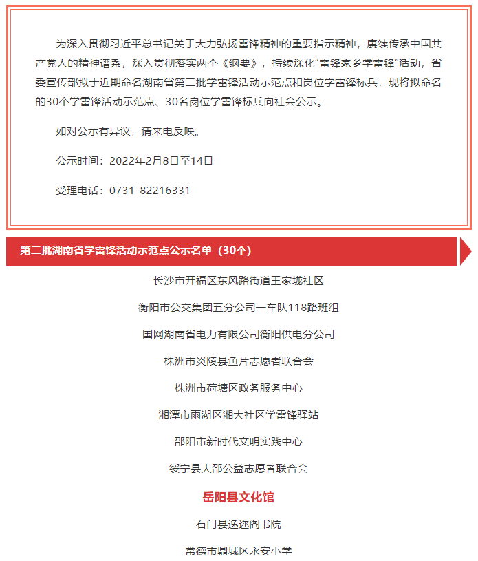 近日,湖南省委宣传部印发《关于命名首批湖南省学雷锋活动示范点和岗位学雷锋标兵的决定》,命名岳阳县文化馆等30个集体为首批湖南省学雷锋活动示范点。