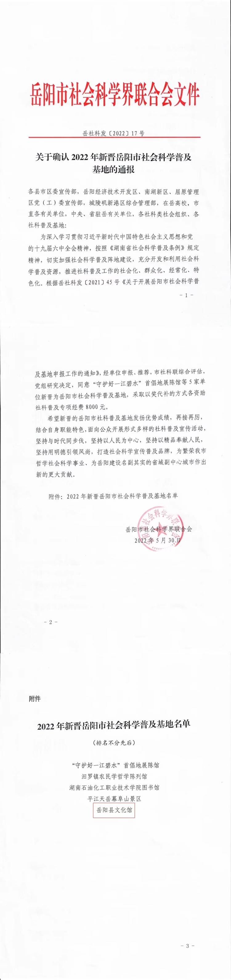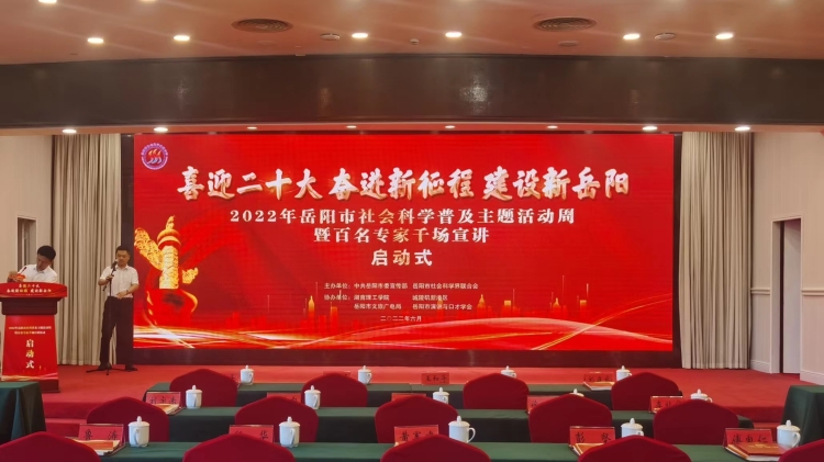 6月7日,中共岳阳市委宣传部、岳阳市社会科学界联合会在南湖宾馆举办“喜迎二十大 奋进新征程 建设新岳阳”2022年岳阳市社会科学普及主题活动周暨百名专家千场宣讲启动式,并为岳阳县文化馆等5家新晋为岳阳市社科普及基地的单位进行了授牌。