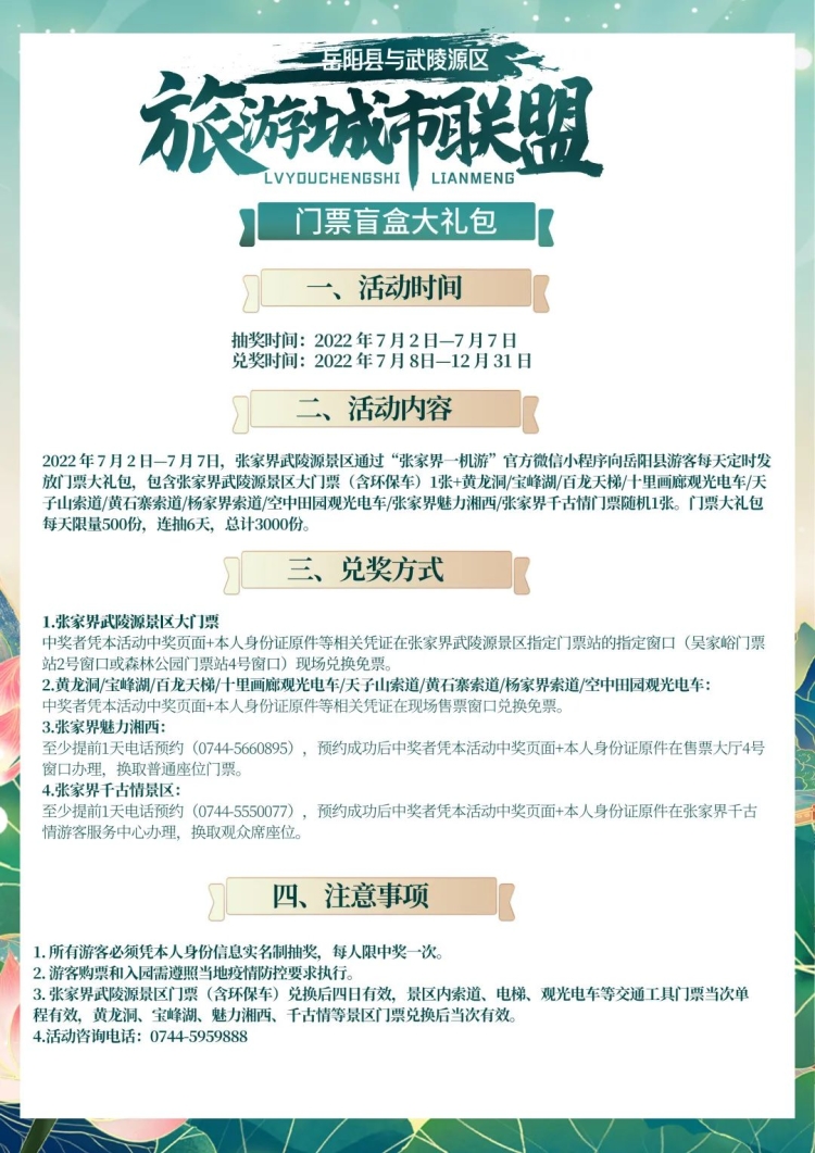 现在好消息来了! 3000份张家界景区旅游门票大礼包 免费 等你来领!在活动开幕式上张家界市武陵源区、张家界市永定区与岳阳县签约合作通过共建旅游城市联盟,推进文旅互动、共建共享。