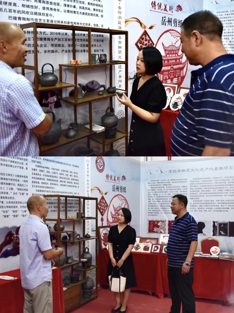岳阳县文化旅游广电局党组书记、局长黄丽娟等相关负责人现场观摩演出,并到岳阳县非物质文化遗产主题展厅参观岳州扇制作技艺、巴陵青陶制作技艺、岳州花灯、岳州剪纸等各级非遗代表性项目的作品展览,与传承人们进行深入交流。