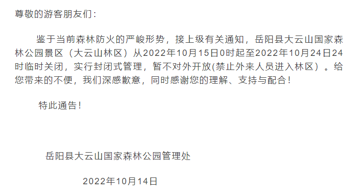 关于大云山国家森林公园景区临时关闭的通告