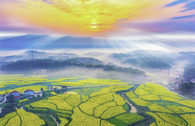 风醉大地麻塘美,雨润田园菜花香。洞庭灵雾山下,金色的阳光跃出山巅,金色麻塘的花海里正流淌着金色的希望。远远望去,那一抹金黄的光泽,与周边翠绿的青山、宁静的村庄相映成趣,勾勒出一幅美丽清新的乡村田园诗画。到了这儿游客可赏花、登山、采果、垂钓·····