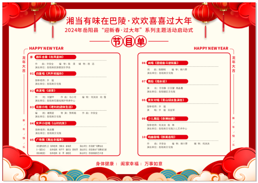 为丰富人民群众春节文化生活,全面展示我县近年来艺术创作的丰硕成果,将举办“湘当有味在巴陵·欢欢喜喜过大年”2024年岳阳县“迎新春·过大年”系列主题活动启动仪式,活动节目涵盖歌舞、戏剧、表演唱、器乐等多种表演形式,将为现场观众送上一台年味十足、精彩纷呈的文化盛宴。