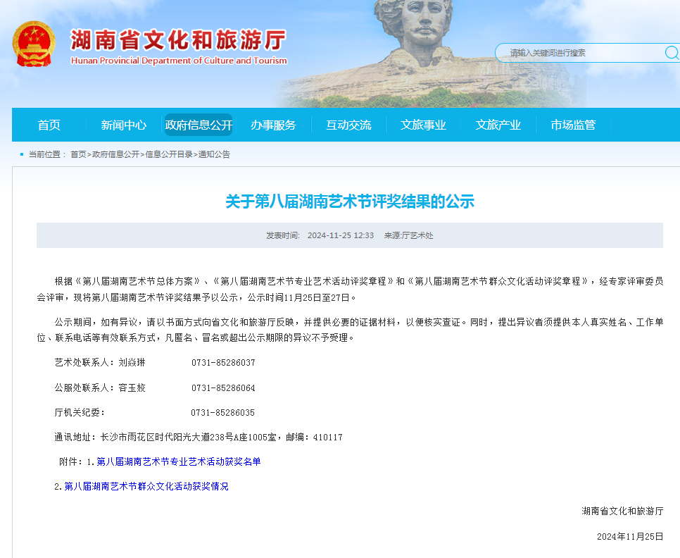 11月25日,第八届湖南艺术节评奖结果公示,岳阳县文化馆参赛作品花鼓小戏《黄马甲》和《八月桂花香》荣获第八届湖南艺术节群众文化活动“三湘群星奖”最佳作品奖;新创花鼓小戏《回家》荣获专业艺术活动田汉小剧目奖。
