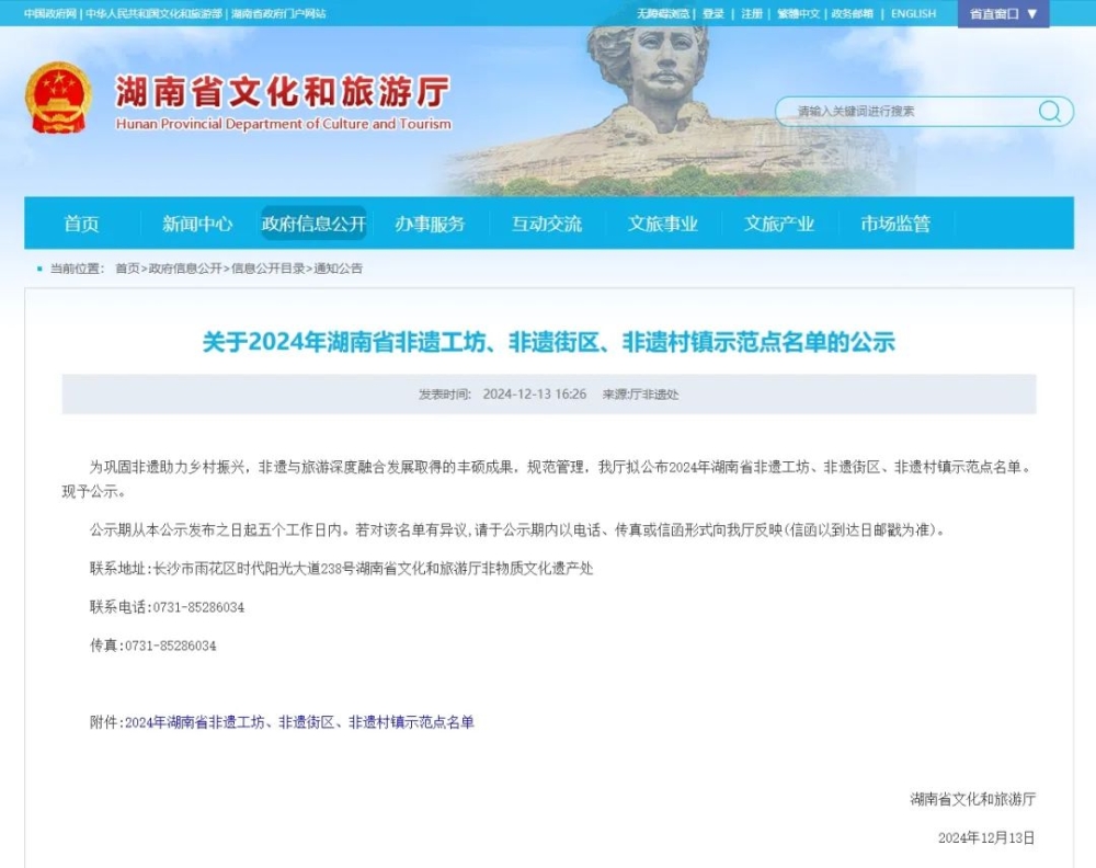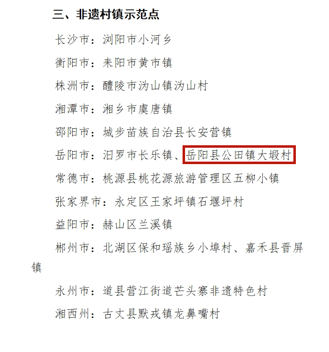 近日,湖南省文化和旅游厅发布了关于2024年湖南省非遗工坊、非遗街区、非遗村镇示范点名单公示,岳阳县公田镇大塅村光荣入选湖南省非遗村镇示范点。
