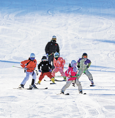 内蒙古自治区呼伦贝尔市扎兰屯金龙山滑雪场,游客在滑雪。