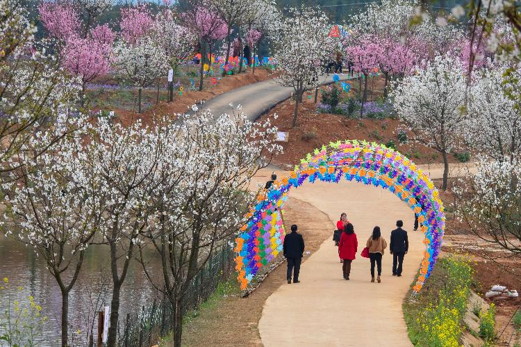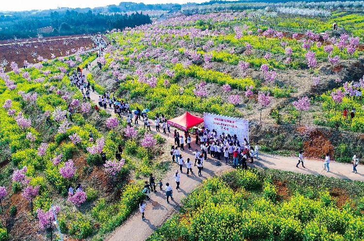 岳阳樱花园占地1063亩,2000年建园,园区先后从全国各地引进大规格樱花数十品种,10万多株,十年以上树龄2万多株,是全国最大专业樱花园。三层三千亩樱海。充分利用樱花落叶透视性強的特点,在樱花树下择时种植花期相同的二月兰,油菜花等千亩草花,杂植落叶紫红玉兰,每年3、4月开花时间,上面千亩樱花盛开,下面千亩草花竞放,中间亿万落樱飞舞,构成花团锦簇的壮丽景观。
