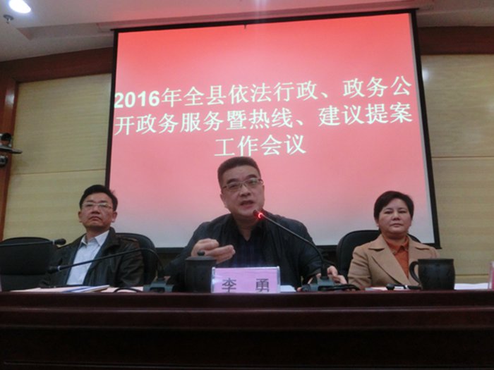 李勇最后强调,各级各部门要把依法行政作为建设法治政府的根本来抓,把政务公开作为建设阳光政府的关键来抓,把政务服务作为建设服务政府的重点来抓,把建议提案办理作为建设责任政府的重大事项来抓。