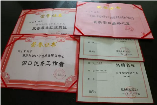 “政府服务部门多个这样的工作人员,就是群众的福分。”有人用朴实的话语这样评价何永军。正是这种用心为民服务的精神,2011-何永军被评为县政务服务中心“窗口优秀工作者”,2012-其所在的窗口被评为“政务服务红旗岗位”,2013、2014-均被确定为-度考核先进个人,2014-还被评为“最美窗口服务之星”。