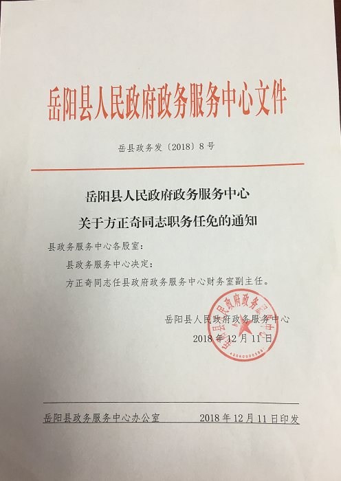 关于方正奇同志职务任免的通知