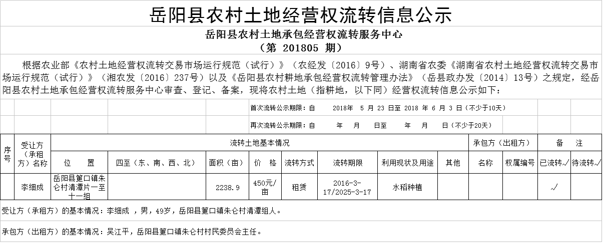 岳阳县农村土地经营权流转信息公示(第201805期)