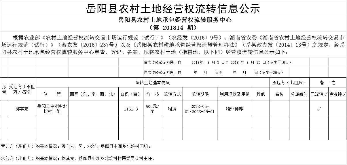 岳阳县农村土地经营权流转信息公示(第 201814 期)