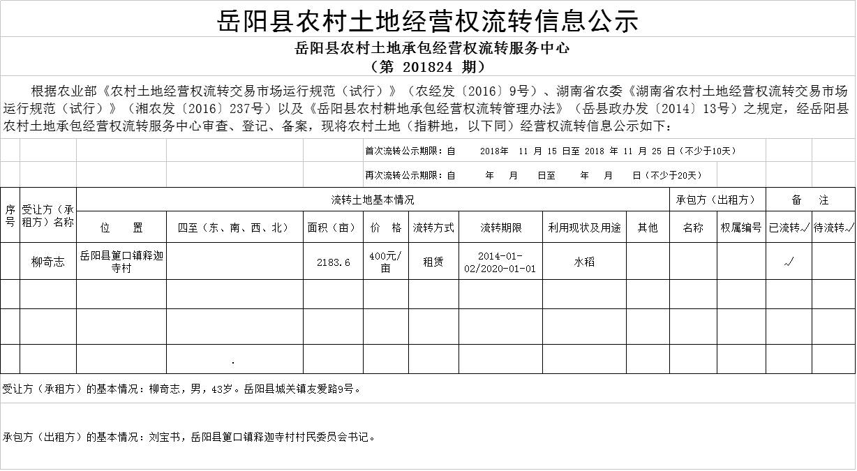 岳阳县农村土地经营权流转信息公示(第 201824 期)