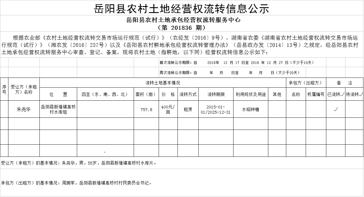 岳阳县农村土地经营权流转信息公示(第 201836 期)