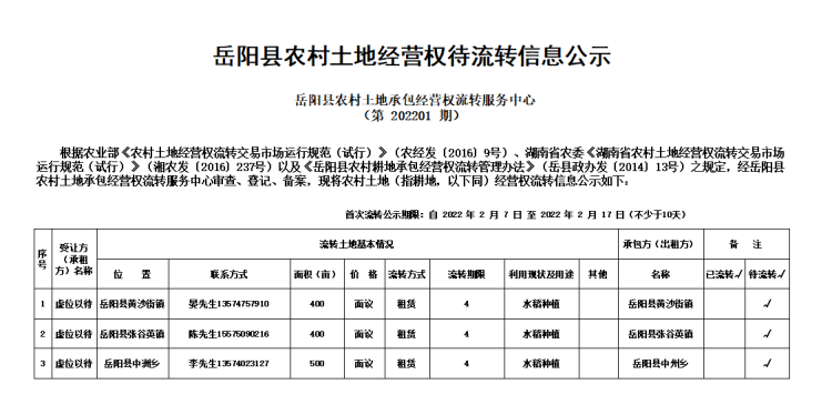 岳阳县农村土地经营权待流转信息公示 (第 202201 期)