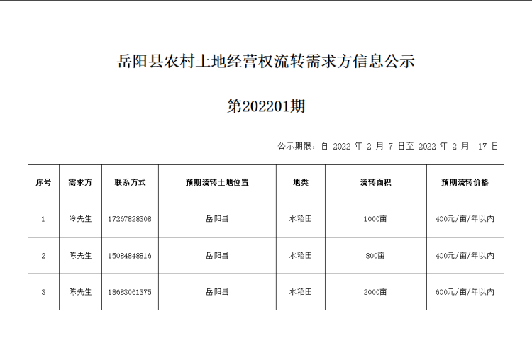 岳阳县农村土地经营权流转需求方信息公示第202201期