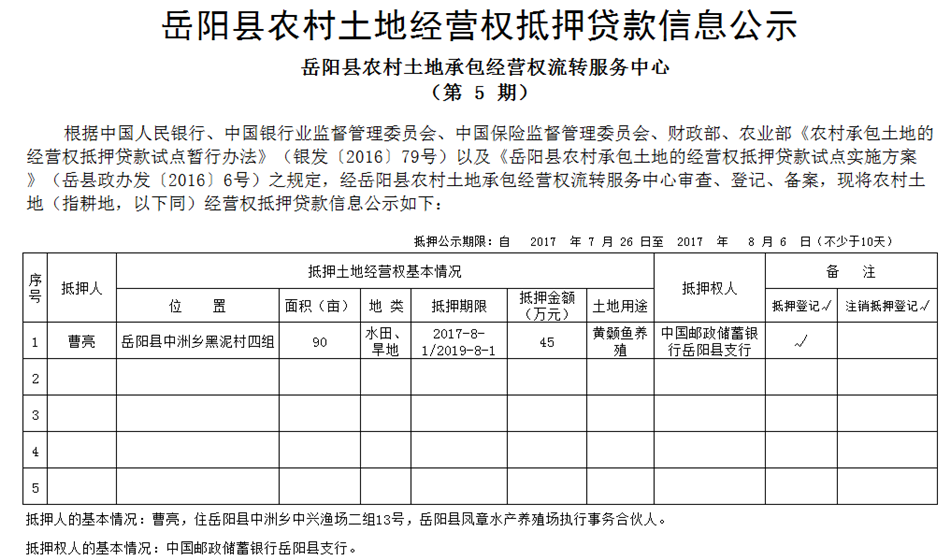 岳阳县农村土地经营权抵押贷款信息公示(第5期)