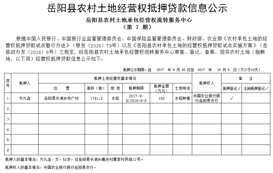 岳阳县农村土地经营权抵押贷款信息公示(第7期)