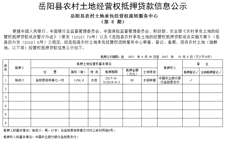 岳阳县农村土地经营权抵押贷款信息公示(第8期)